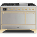 Ilve Majestic II Collection UM12FDQNS3SSG 48 Inch Freestanding Dual Fuel Range with 8 Sealed Burners, 5.02 cu. ft. Total Capacity, Warming Drawer, Fast Pre-Heat, and Griddle: Stainless Steel, Brass Trim