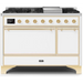 Ilve Majestic II Collection UM12FDQNS3WHG 48 Inch Freestanding Dual Fuel Range with 8 Sealed Burners, 5.02 cu. ft. Total Capacity, Warming Drawer, Fast Pre-Heat, and Griddle: White, Brass Trim