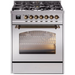 Ilve Nostalgie II Collection UP30NMPSSB 30 Inch Freestanding Dual Fuel Range with 5 Sealed Burners, 4 cu. ft. Oven Capacity, Storage Drawer, and Quick Start: Stainless Steel, Burnished Trim - NG
