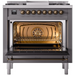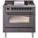 Ilve Nostalgie II Collection UP36FNMPMGB 36 Inch Freestanding Dual Fuel Range with 6 Sealed Burners, 3.5 cu. ft. Oven Capacity, Storage Drawer, Quick Start, Soft Closing Door and Griddle: Matte Graphite, Burnished Trim