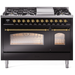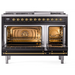 Ilve Nostalgie II Collection UP48FSNMPBKG 48 Inch Freestanding Dual Fuel Range with 5 Sealed Burners, 5.02 cu. ft. Total Capacity, Double Oven, Fry Top, Coup de Feu, Storage, 9 Oven Functions, Soft Closing Doors, Cast Iron Grates: Glossy Black, Brass Trim