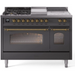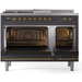 Ilve Nostalgie II Collection UP48FSNMPMGG 48 Inch Freestanding Dual Fuel Range with 5 Sealed Burners, 5.02 cu. ft. Total Capacity, Double Oven, Fry Top, Coup de Feu, Storage, 9 Oven Functions, Soft Closing Doors: Graphite Matte, Brass Trim