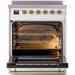 Ilve Nostalgie II Collection UPI304NMPWHG 30 Inch Freestanding Induction Range with 4 Elements, 4 Cu. Ft. Oven Capacity, Convection, Residual Heat Indicator, Booster Function, Storage Drawer, Fast Pre-Heat Mode, Defrost Function, White with Brass Trim
